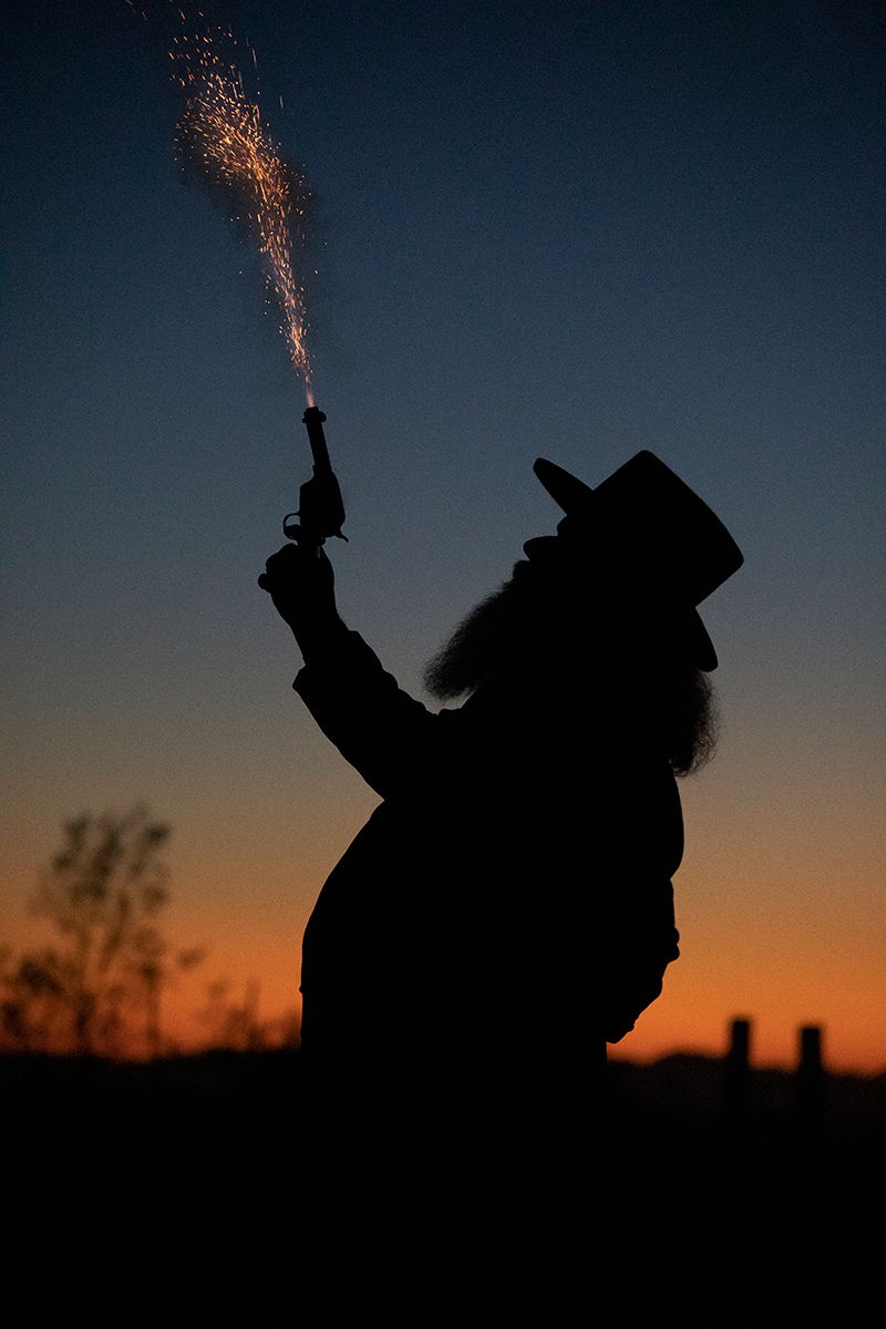Review the description above, but notice how half of the gunman is missing because his body is below the horizon. Photographing him from a low-to-high position, instead of a standing position, will help ensure his body is in silhouette (compare image above vs images to the right or below)